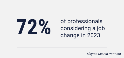 The results appeared to align with the overarching workplace trends of the last year. Of the professionals Slayton surveyed—most of whom were senior-level leaders and managers—72% reported they were seriously considering a job change in 2023.
