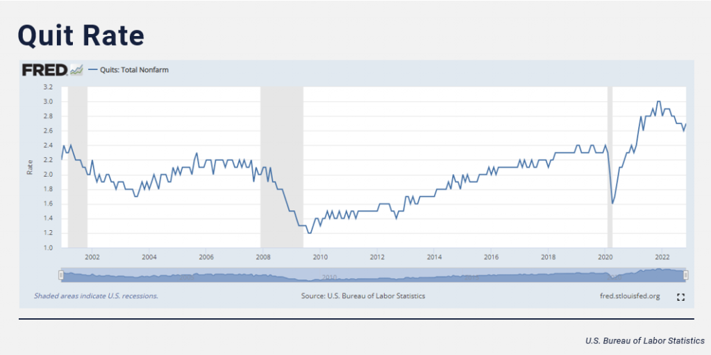 If that number sounds shocking at first glance, let us provide some context. It is critical to note that not everyone who is seeking a new opportunity will actually find what they’re looking for or follow through on that desire. The actual quit rate—on a national, cross-industry basis—is right around 2.7%, according to the BLS.
